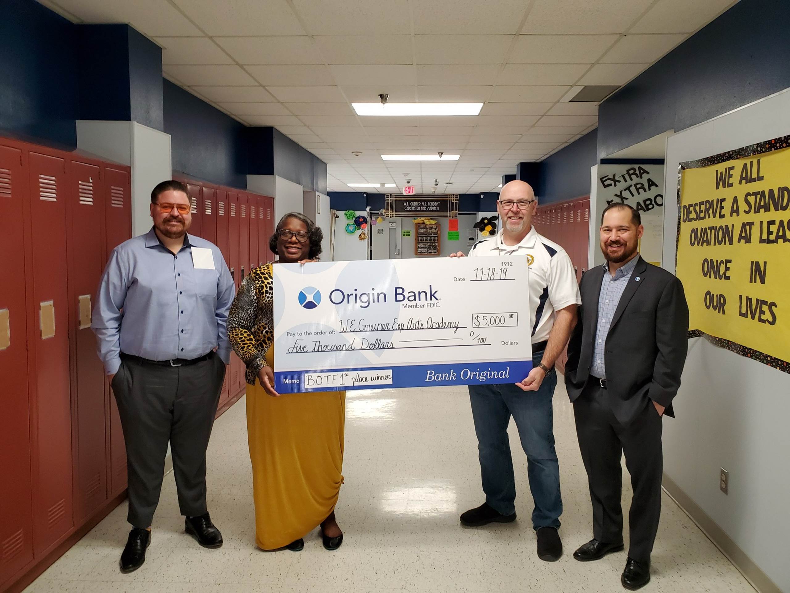 In Texas, 14 schools near Origin’s new Sylvan 30 Banking Center took part. Greiner Middle School won the top prize of $5,000, Moises E. Molina High School won the second-place award of $3,000, while Mary McLeod Bethune Elementary and St. Elizabeth of Hungary Catholic School tied for third place and each received $2,000.