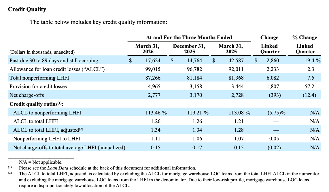 - Total loans held for investment (“LHFI”) were $7.86 billion at March 31, 2026, reflecting an increase of $193.3 million, or 2.5%, compared to December 31, 2025. LHFI, excluding mortgage warehouse lines of credit (“mortgage warehouse LOC”), were $7.34 billion at March 31, 2026, reflecting an increase of $199.8 million, or 2.8%, compared to December 31, 2025.