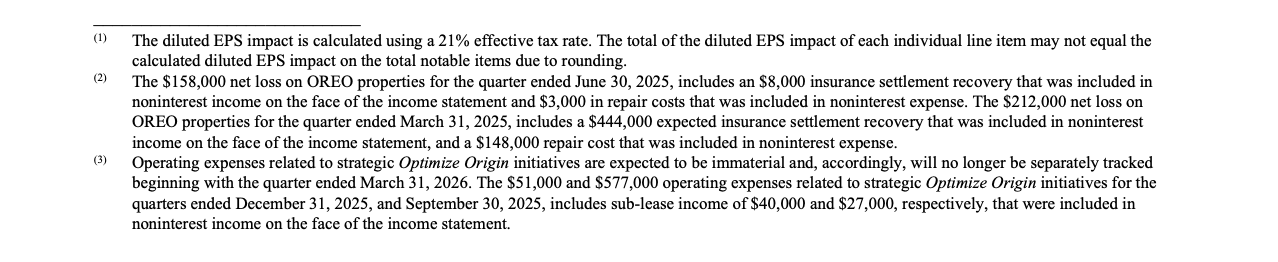 - Total subordinated debentures at March 31, 2026, were $16.6 million, a decrease of $73.0 million, or 81.5%, compared to March 31, 2025, due to the redemption of $74.0 million in subordinated debentures during the quarter ended December 31, 2025, in conjunction with our Optimize Origin initiative.
