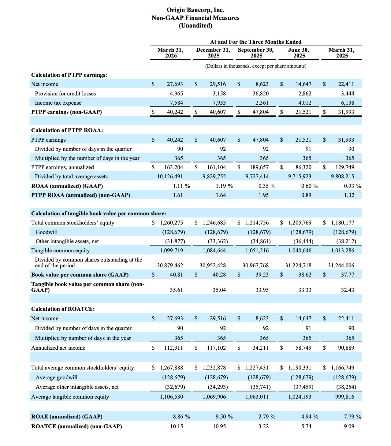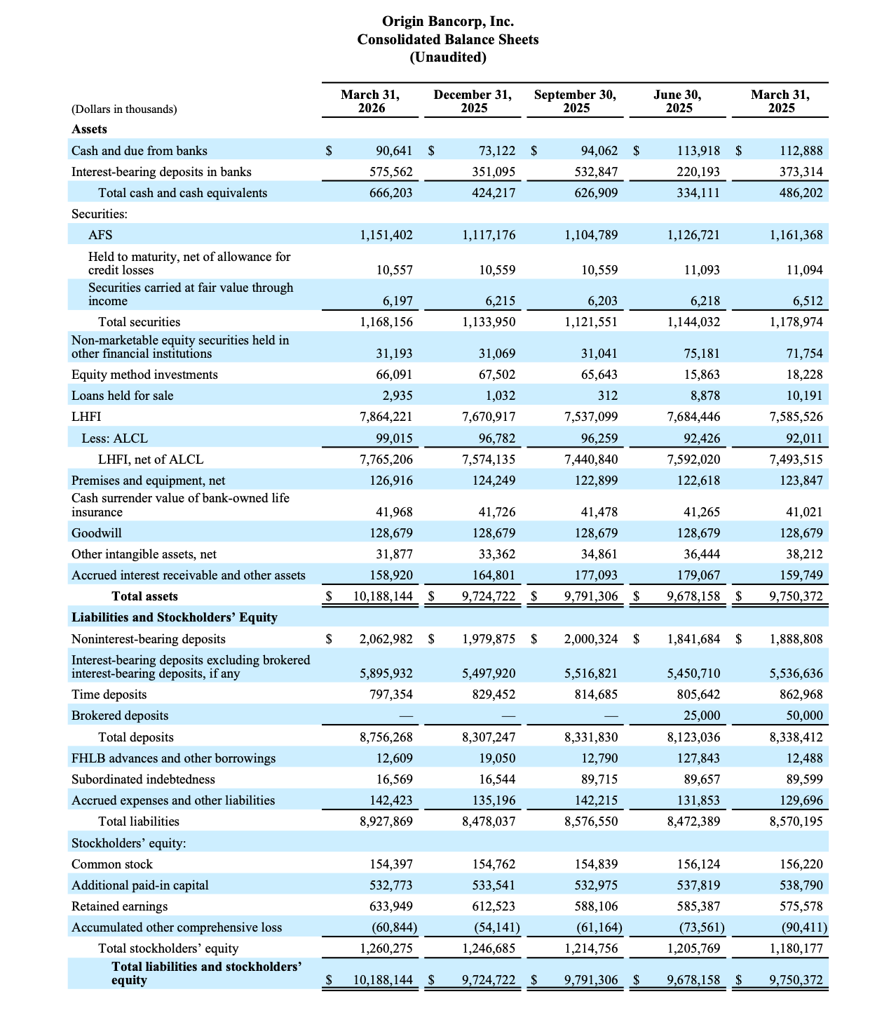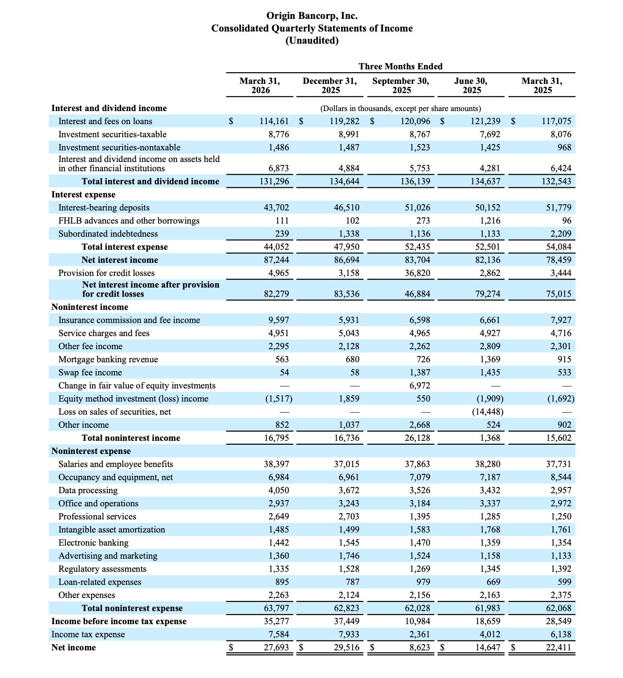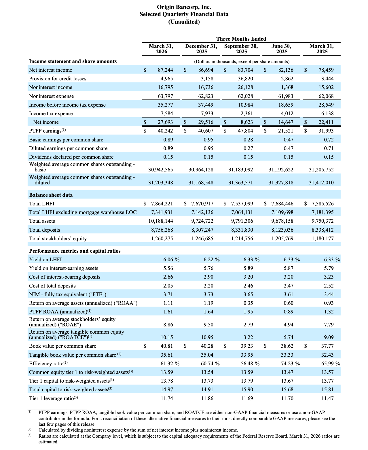 Origin Bancorp, Inc. (NYSE: OBK) (“Origin,” “we,” “our” or the “Company”), the holding company for Origin Bank (the “Bank”), today announced net income of $27.7 million, or $0.89 diluted earnings per share (“EPS”) for the quarter ended March 31, 2026, compared to net income of $29.5 million, or $0.95 diluted EPS, for the quarter ended December 31, 2025. Pre-tax, pre-provision (“PTPP”)(1) earnings were $40.2 million for the quarter ended March 31, 2026, compared to $40.6 million for the linked quarter.