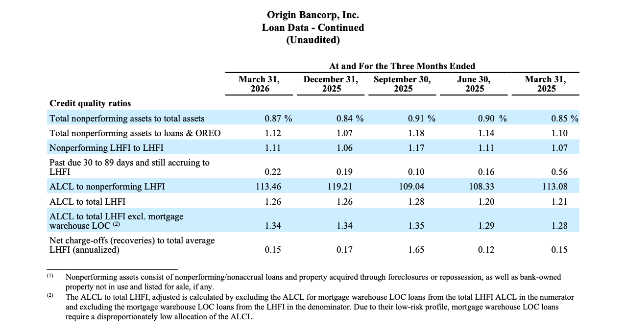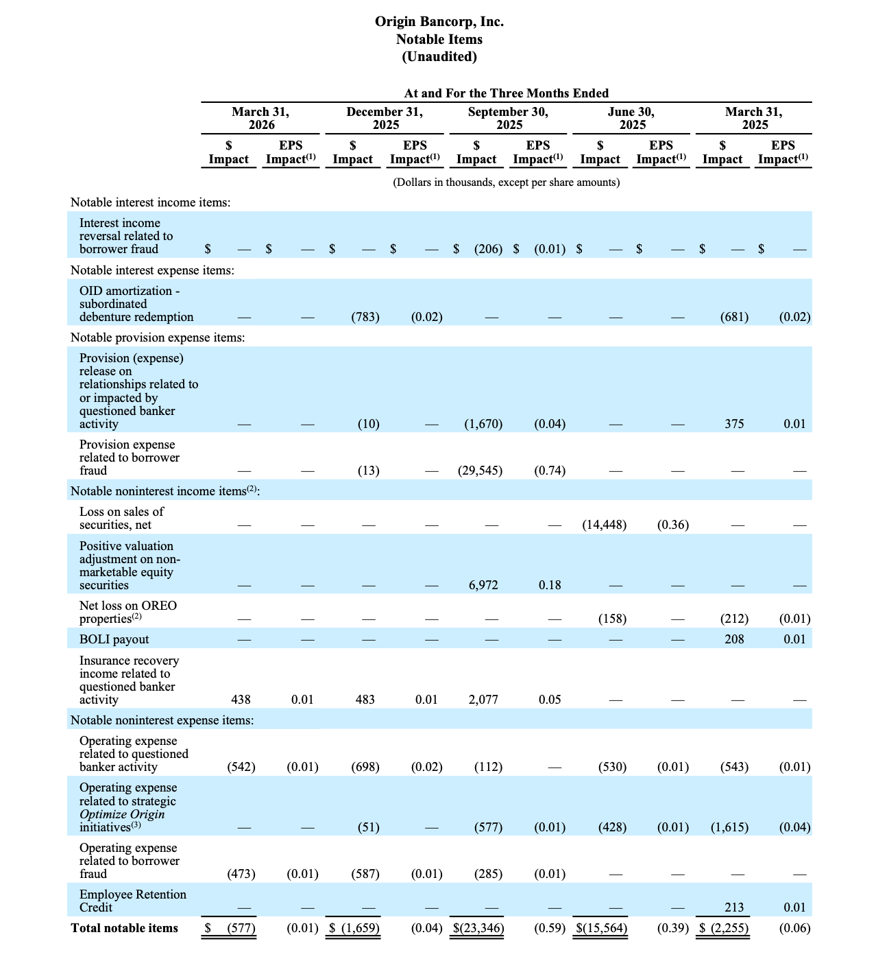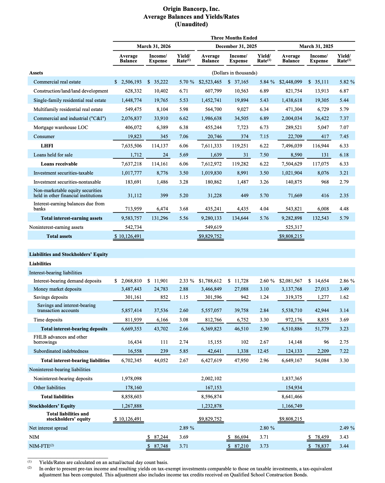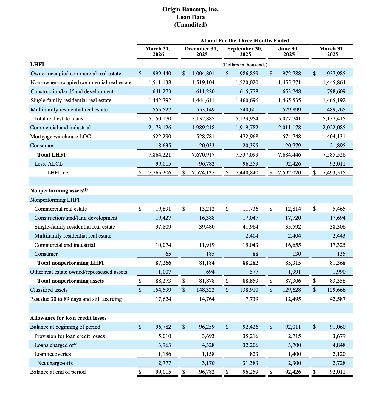 Origin Bancorp, Inc. (NYSE: OBK) (“Origin,” “we,” “our” or the “Company”), the holding company for Origin Bank (the “Bank”), today announced net income of $27.7 million, or $0.89 diluted earnings per share (“EPS”) for the quarter ended March 31, 2026, compared to net income of $29.5 million, or $0.95 diluted EPS, for the quarter ended December 31, 2025. Pre-tax, pre-provision (“PTPP”)(1) earnings were $40.2 million for the quarter ended March 31, 2026, compared to $40.6 million for the linked quarter.