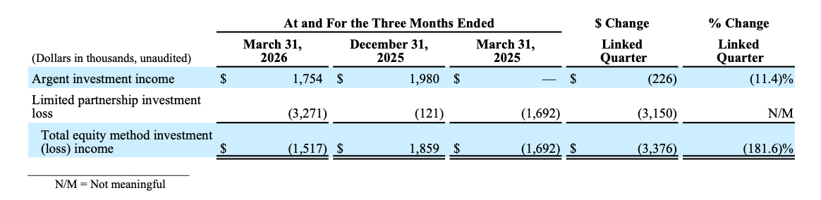 Noninterest income for the quarter ended March 31, 2026, was $16.8 million, an increase of $59,000 from the linked quarter, primarily driven by an increase of $3.7 million in insurance commission and fee income, which was largely offset by a decrease of $3.4 million in equity method investment (loss) income.