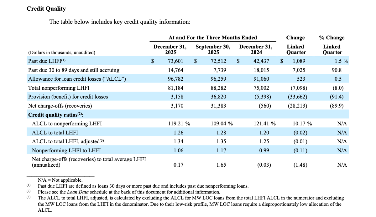 - Excluding MW LOC, LHFI increased $78.0 million, or 1.1%, from September 30, 2025. The increase was primarily driven by increases of $69.4 million and $17.9 million in commercial and industrial loans and owner-occupied commercial real estate loans, respectively. These increases were partially offset by a decrease of $16.1 million in single family residential real estate.