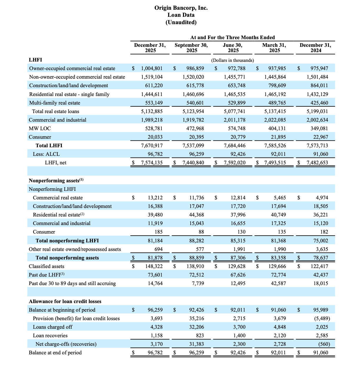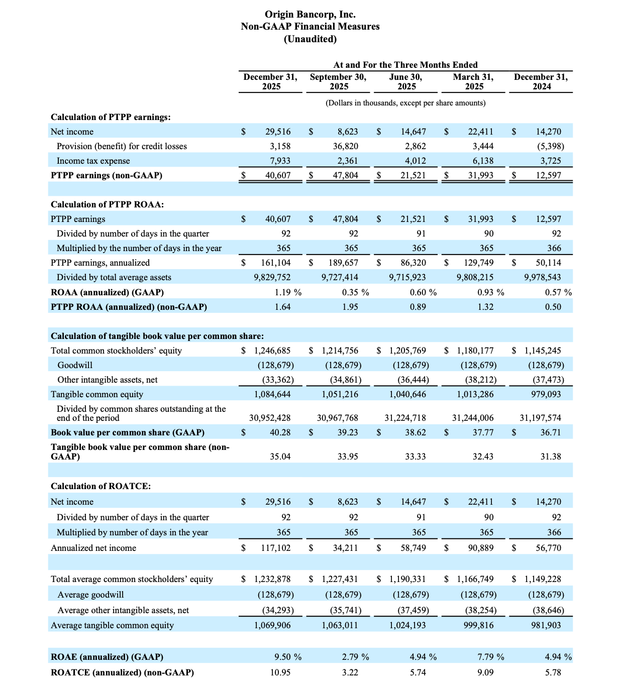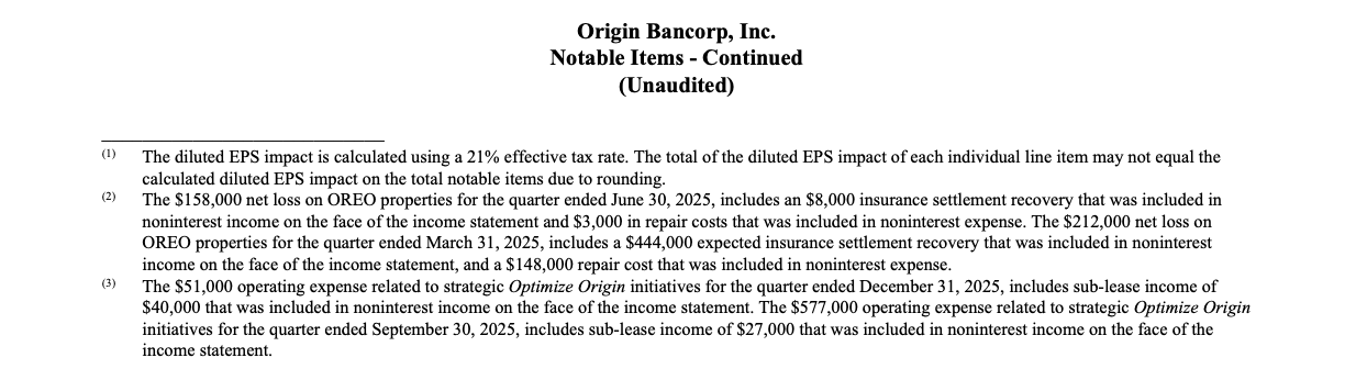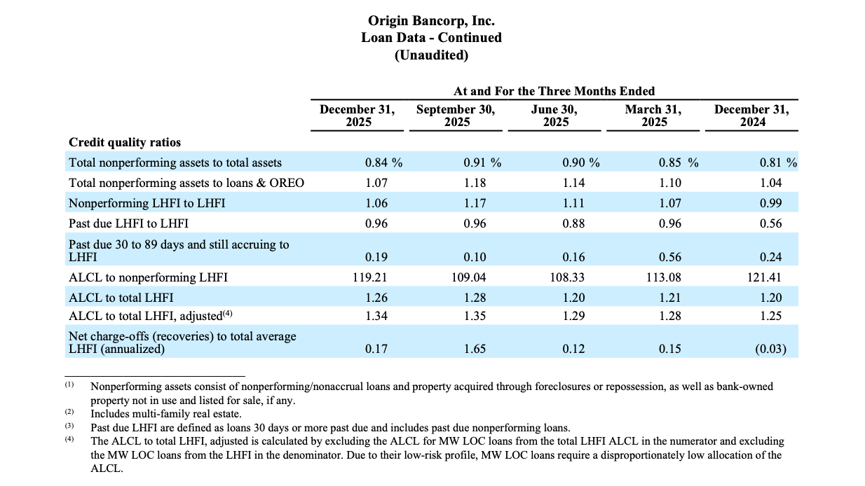 Origin Bancorp, Inc. (NYSE: OBK) (“Origin,” “we,” “our” or the “Company”), the holding company for Origin Bank (the “Bank”), today announced net income of $29.5 million, or $0.95 diluted earnings per share (“EPS”) for the quarter ended December 31, 2025, compared to net income of $8.6 million, or $0.27 diluted EPS, for the quarter ended September 30, 2025. Pre-tax, pre-provision (“PTPP”)(1) earnings were $40.6 million for the quarter ended December 31, 2025, compared to $47.8 million for the linked quarter.