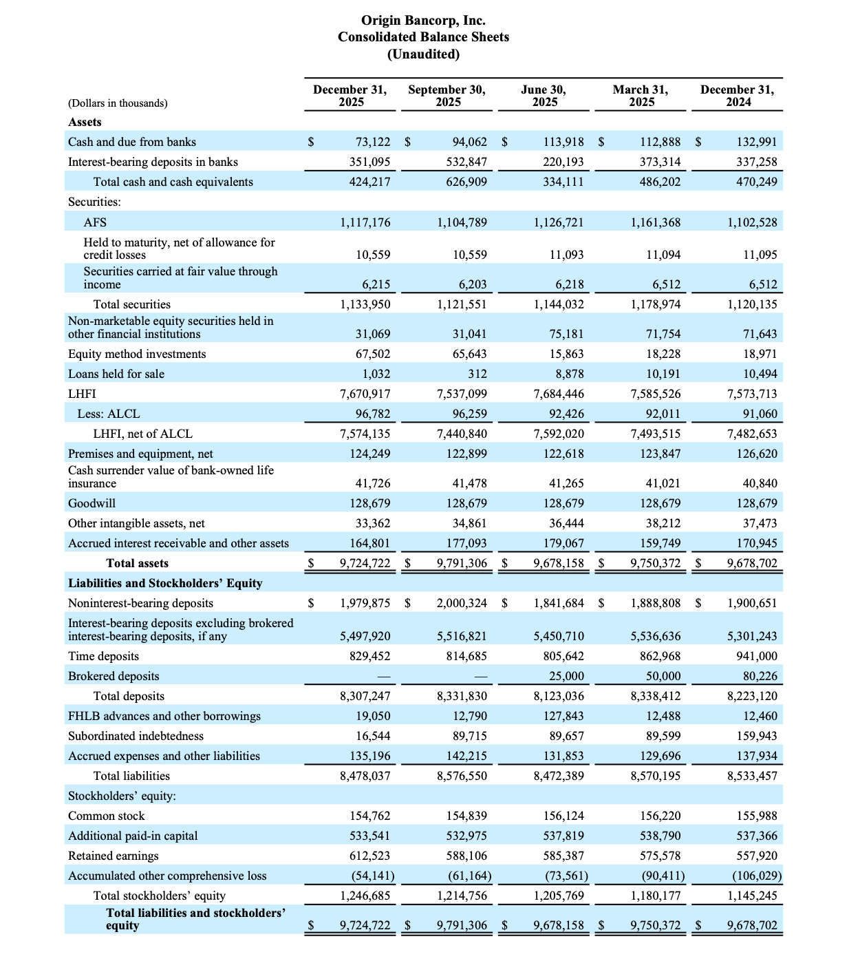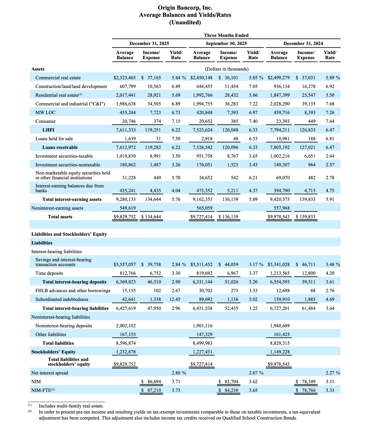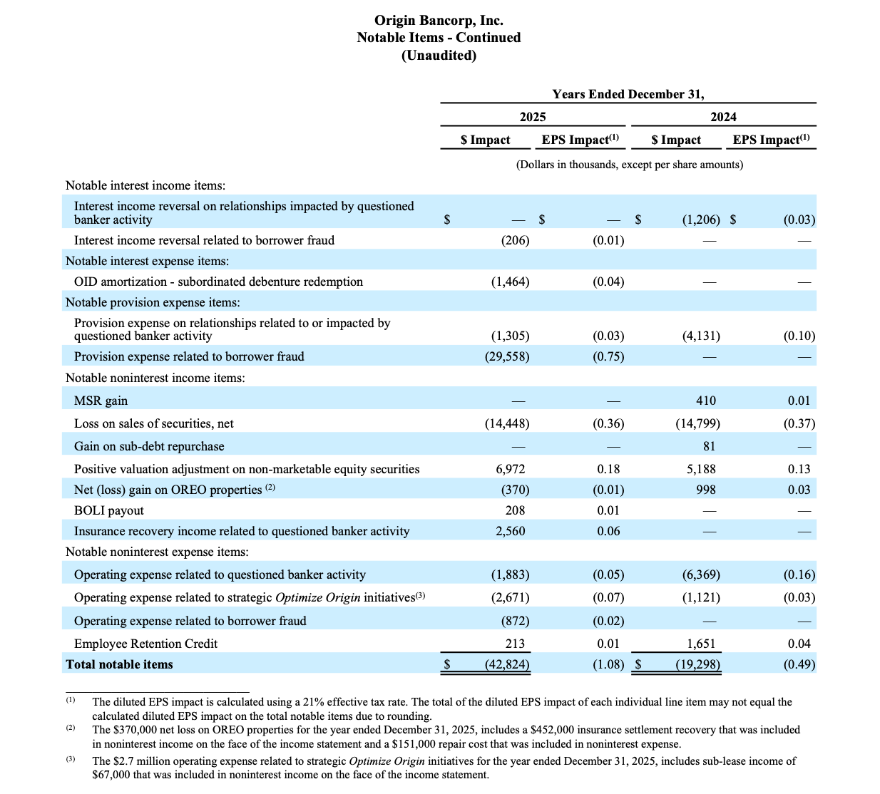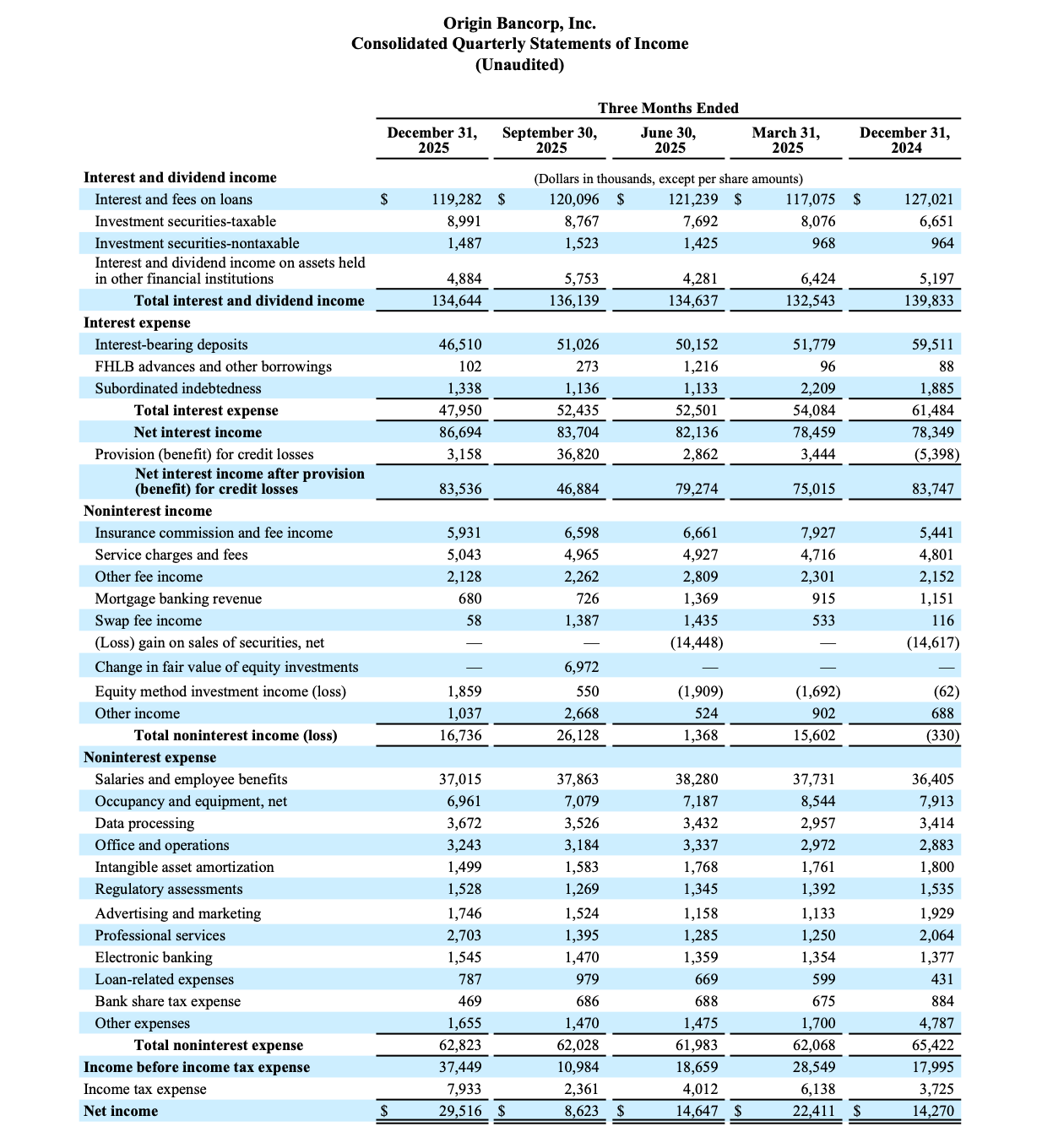 Origin Bancorp, Inc. (NYSE: OBK) (“Origin,” “we,” “our” or the “Company”), the holding company for Origin Bank (the “Bank”), today announced net income of $29.5 million, or $0.95 diluted earnings per share (“EPS”) for the quarter ended December 31, 2025, compared to net income of $8.6 million, or $0.27 diluted EPS, for the quarter ended September 30, 2025. Pre-tax, pre-provision (“PTPP”)(1) earnings were $40.6 million for the quarter ended December 31, 2025, compared to $47.8 million for the linked quarter.