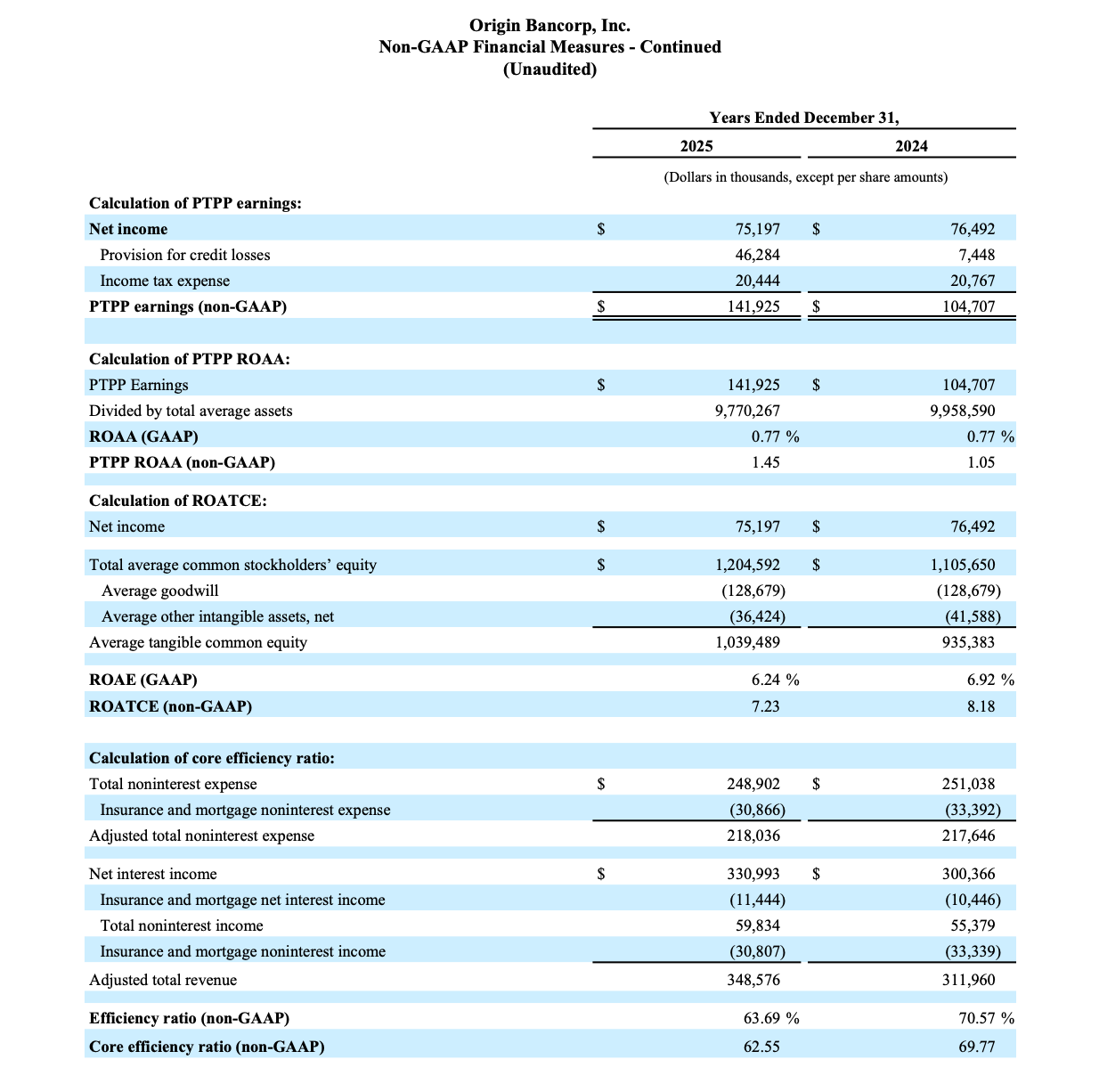 Origin reports its results in accordance with generally accepted accounting principles in the United States of America ("GAAP"). However, management believes that certain supplemental non-GAAP financial measures may provide meaningful information to investors that is useful in understanding Origin's results of operations and underlying trends in its business. However, non-GAAP financial measures are supplemental and should be viewed in addition to, and not as an alternative for, Origin's reported results prepared in accordance with GAAP. The following are the non-GAAP measures used in this release: PTPP earnings, PTPP ROAA, tangible book value per common share, ROATCE, and core efficiency ratio.
