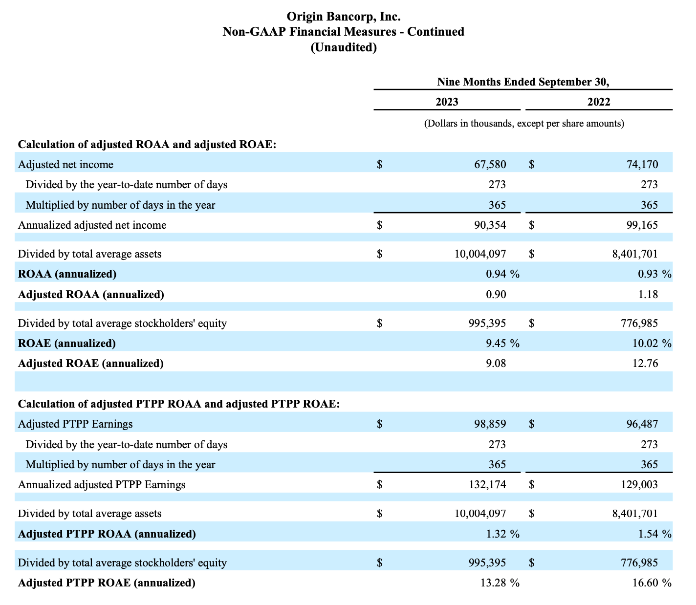 Origin reports its results in accordance with generally accepted accounting principles in the United States of America ("GAAP"). However, management believes that certain supplemental non-GAAP financial measures may provide meaningful information to investors that is useful in understanding Origin's results of operations and underlying trends in its business. However, non-GAAP financial measures are supplemental and should be viewed in addition to, and not as an alternative for, Origin's reported results prepared in accordance with GAAP. The following are the non-GAAP measures used in this release: adjusted net income, adjusted PTPP earnings, adjusted diluted EPS, NIM-FTE, adjusted, adjusted ROAA, adjusted PTPP ROAA, adjusted ROAE, adjusted PTPP ROAE, tangible book value per common share, adjusted tangible book value per common share, tangible common equity to tangible assets, ROATCE, adjusted ROATCE and adjusted efficiency ratio.